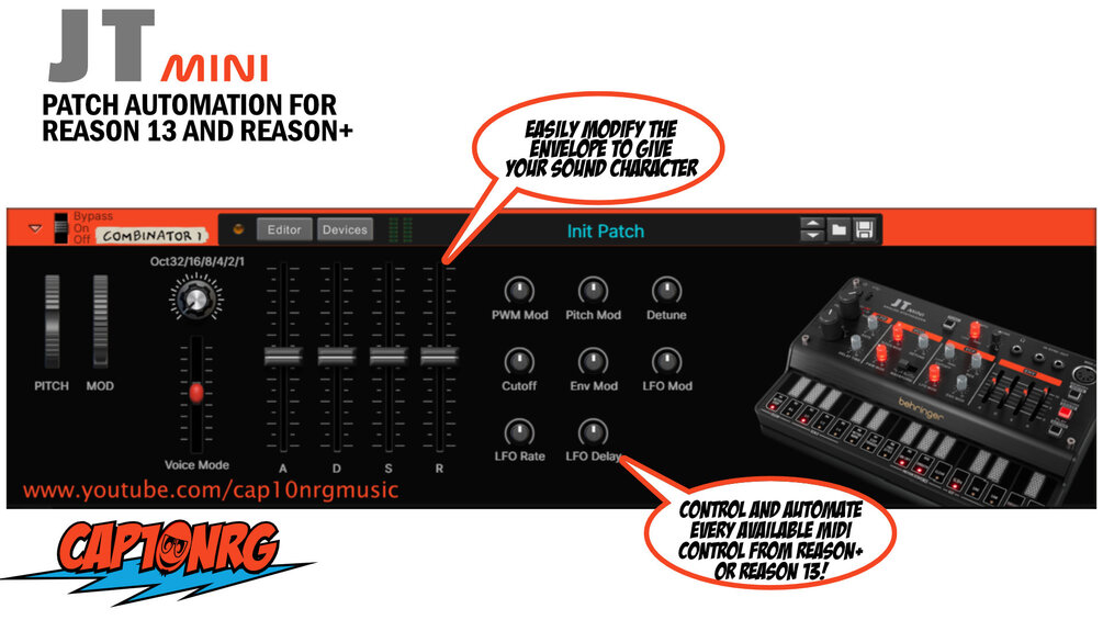 If you use Reason 13 or Reason Plus, and have a Behringer JT-Mini synthesizer and want to easily automate the sound coming out of this little orange beast then prepare to get excited because I've I got what you need right! I built an easy to use automation combinator that will let you record automation for pretty much everything on this amazing powerhouse of a synth. For the price and for the size this thing definitely brings the power to your music, and now you can push that power into over drive!! With this combinator you can automate: ADSR Envelope Cutoff Envelope Modulation LFO Modulation, Rate and Delay Octave, Pitch Modulation and Detune Voice Mode So basically if there is a MIDI Control Code, you can automate that parameter in Reason!! I am trying something new out with this Combinator, and leaving what you donate for this device up to you!! If you think it's only worth a dollar, donate one dollar - if you think it's worth a million dollars.... Well let's just say there will be some BIG giveaways if that were to happen!! :D The package includes 1 combinators. As far as setup all you have to do in copy the combinator to your drive and update the device it references in the combinator. Tutorial is on the way to make life even easier :D All proceeds from sales of this editor will be used to support the channel (www.youtube.com/cap10nrgmusic)
